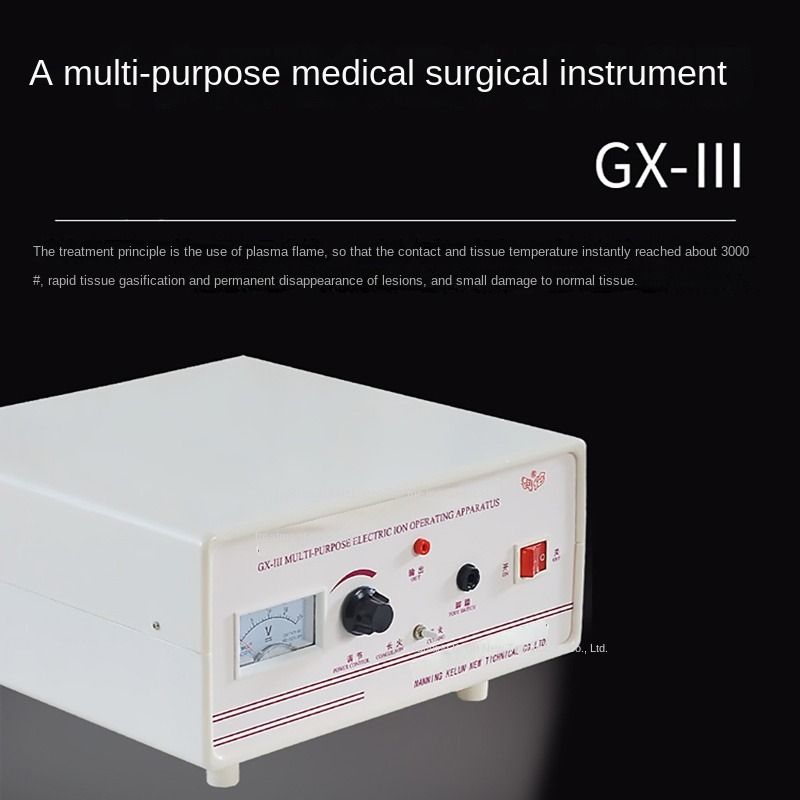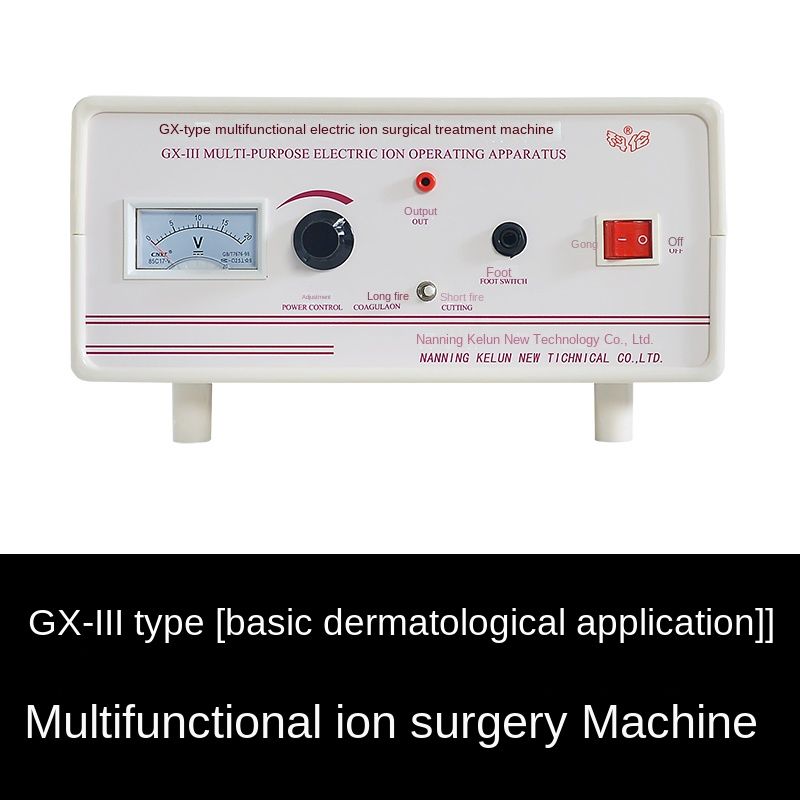 Electro-ion surgery machine Features: 1. Treatment can be performed by bringing the metal contact close to or inserting it into human tissue. The stylus-type operation is simple, accurate, and convenient. It can work continuously or intermittently through the foot switch. 2. It has long fire and short fire, which can meet the needs of treating different diseases. Features of long fire: weak breakdown force, large sparks, large surface destructive power, large treatment spot, good hemostasis, mainly used for ENT, gynecology and other bleeding surgeries. Features of short fire: strong breakdown force, small sparks, can destroy the inside of the tissue, small treatment spot, can be used for dermatology, surgery, tissue cutting and other surgeries that are not easy to bleed. 3. The output power is continuously adjustable. Increasing the power can gasify the cut tissue, and vice versa, it has a coagulation effect. 4. The metal treatment head is easy to equip and can be lengthened or bent by itself to adapt to treatments of different depths and angles. 2. Technical indicators: 1. Power supply voltage: 220V ± 10% Frequency: 50HZ 2. Power: 100VA 3. Volume: 14x32x32cm3 4. Weight: 6kg 3. Application scope: 1. Dermatology: freckles, various pigmented nevi, flat warts, common warts, plantar warts, condyloma acuminatum, vascular nevi, capillary hemangioma, capillary dilatation, skin growths, xanthelasma, trichoepithelioma, verrucous nevus, sebaceous nevus, sweat gland tumor, syringoma, senile plaque, congenital pigmented spots, hemorrhagic granuloma, skin horn, rosacea, tattoo removal, eyebrow tattoo removal, ulcer surface slough removal, corns, repair of certain scars, etc. 2. Surgery (anorectal department): axillary odor, circumcision, anal fissure, anal fistula, perianal abscess, external hemorrhoids, rectal polyps, anal papilloma, urethral meat caruncle, etc. 3. Stomatology: gingival hyperplasia, gingival tumor, gingival bleeding, lichen planus, pericoronitis of wisdom teeth, oral ulcer, oral cyst, etc. 4. Otolaryngology: nasal polyps, ear, external auditory canal tumor, chronic pharyngitis, tonsillitis, hanging edema, tongue tie surgery, etc. 5. Gynecology: cervical erosion, cervical polyps, vaginal cyst, etc.